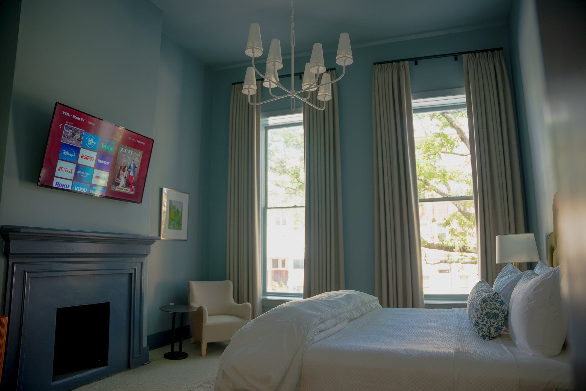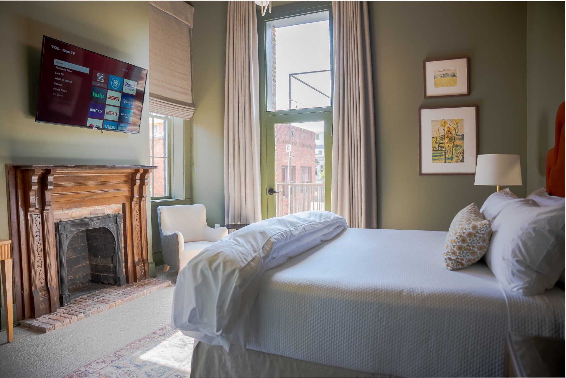 Every room offers a different view, whether it’s the shops, greenspace, and historic church spires across Second Street -- or the antique brick and gabled skylights of Mulberry Street Lane, the alley we share with local restaurants. With our 19th-century building’s huge picture windows and towering ceilings, even our coziest rooms feel spacious. We especially love the antique pressed-tin ceiling tiles and dormant fireplaces in many of the rooms.