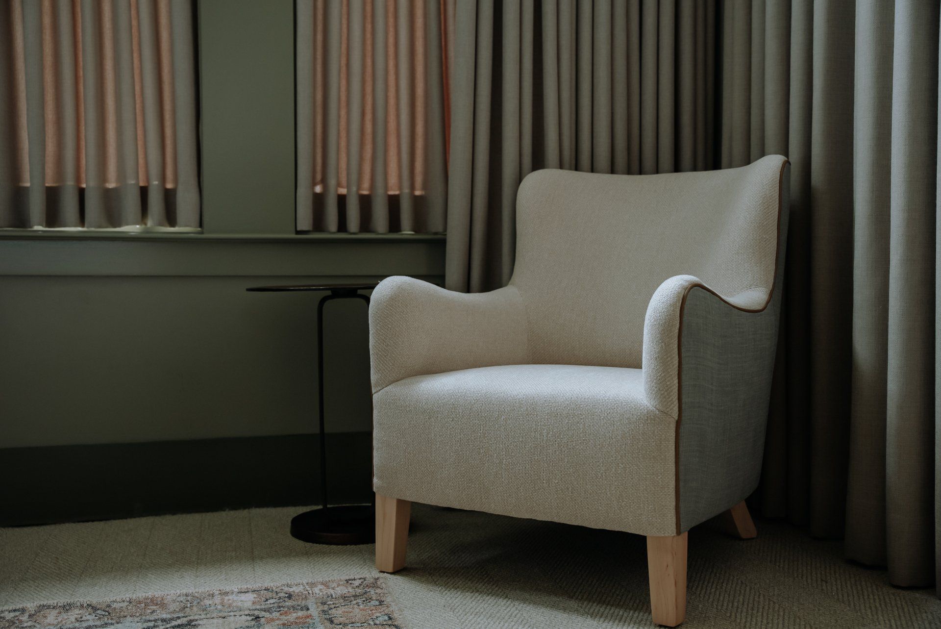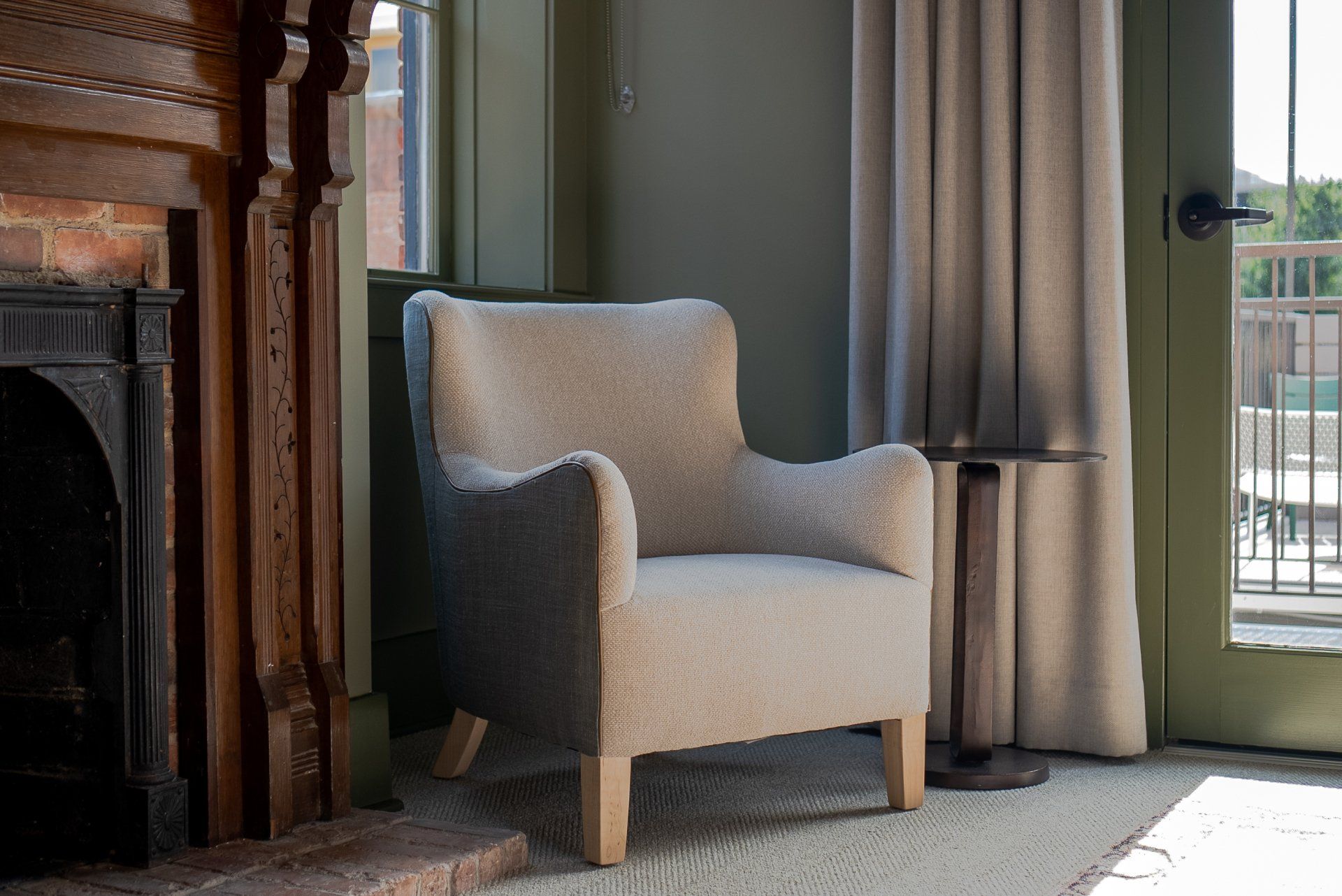 Our two Junior Queen rooms (3 & 4) have the smallest footprint, but their tall ceilings and soothing colors still offer a sense of spaciousness. They have all the same amenities as the larger rooms: ensuite bathroom, reading chair, writing desk, coffee maker, white noise machine, iron, and ironing board.