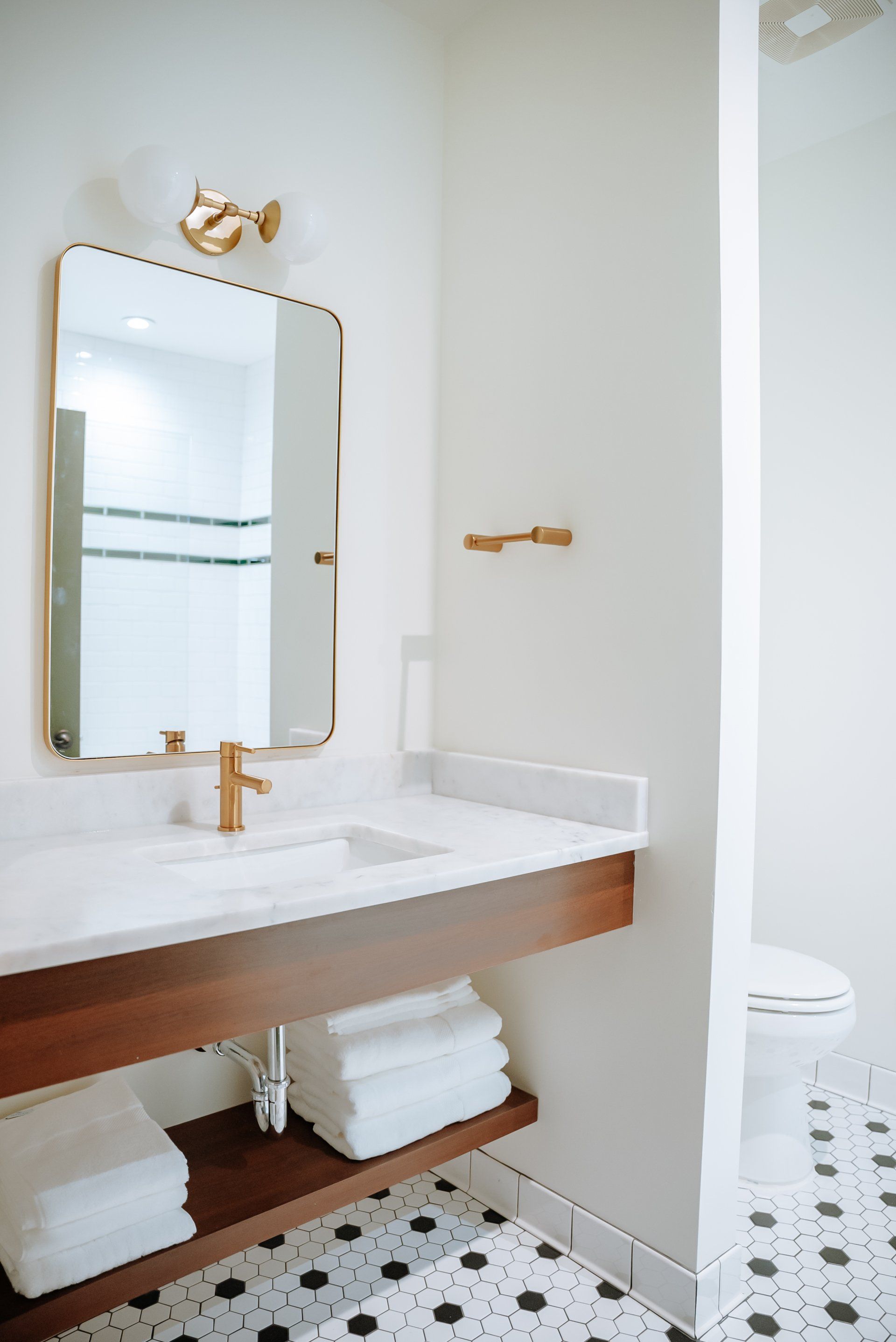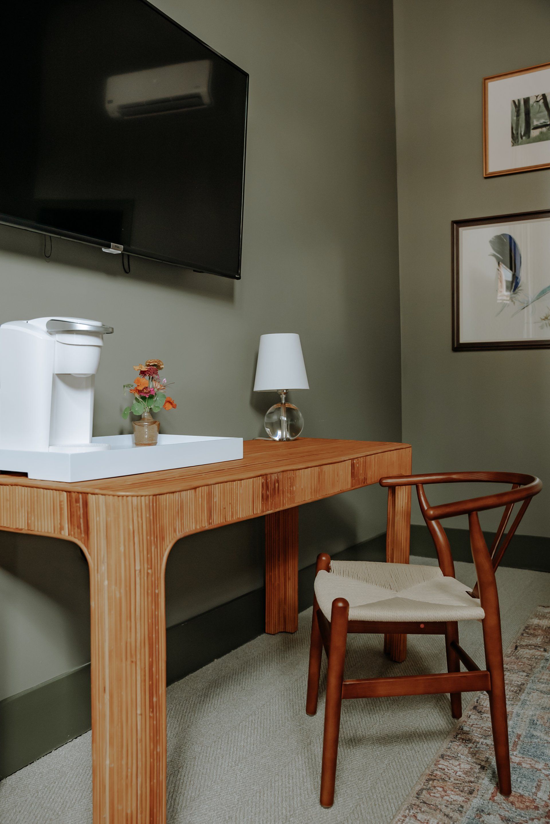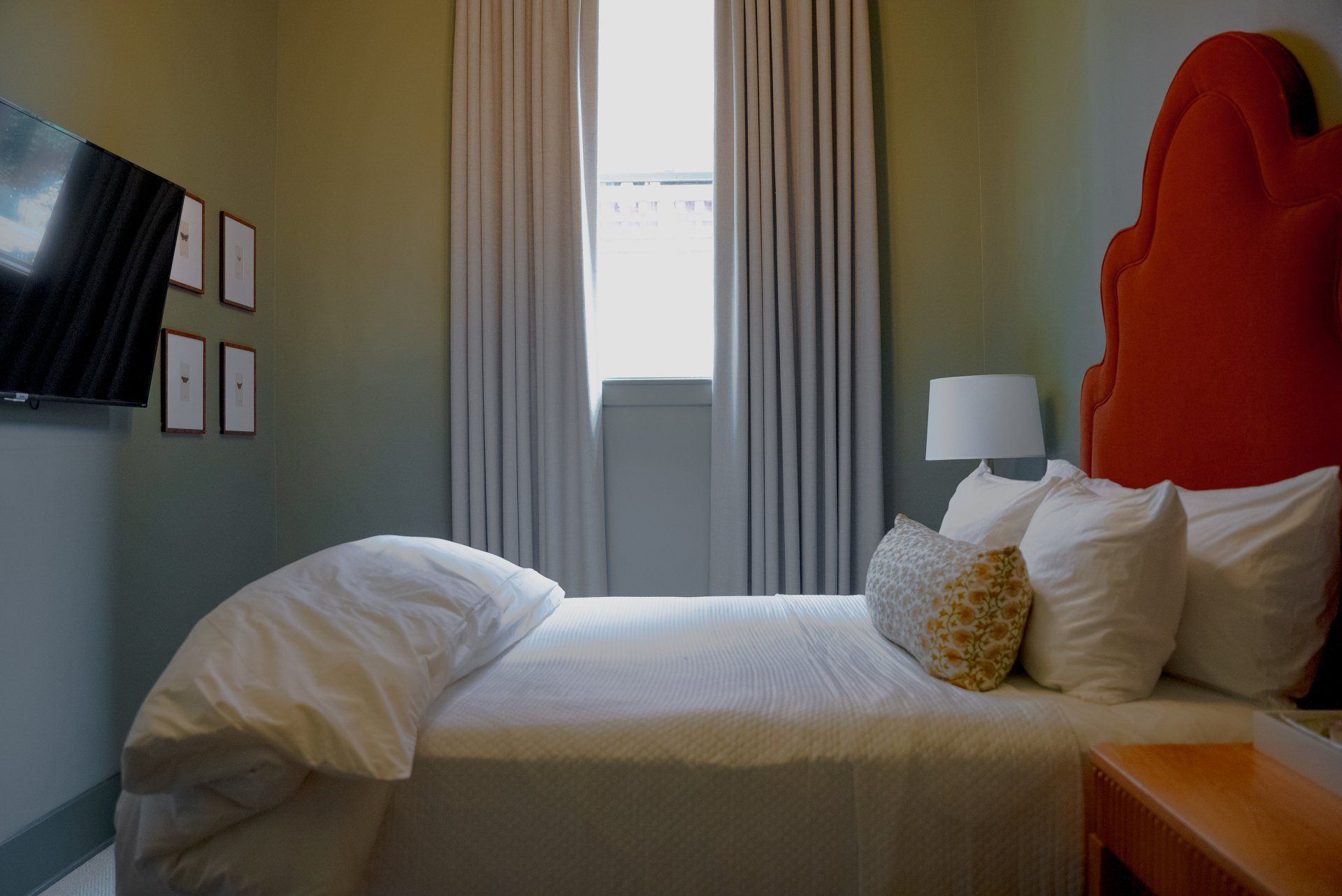 With its forest green alcoves and Sputnik chandelier, Room 5 has personality. Located closest to the ramp for guests who use mobility supports and designed to ADA standards with plenty of space to maneuver, as well as grab bars, handrails, and braille, with easy access to the bar, Room 5 offers convenient access to all hotel amenities and everything downtown has to offer.