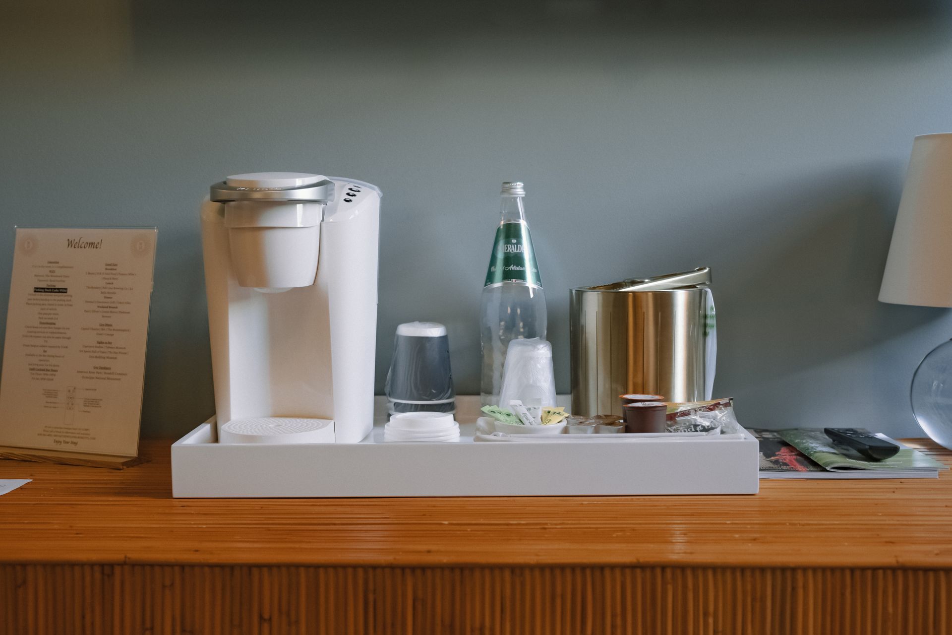 Swathed in shades of blue, Room 7 is a dreamy escape from the world. This large room features two huge picture windows, upholstered king-sized bed, nightstands with charging outlets, ensuite bathroom, writing desk, reading chair, flatscreen TV, coffeemaker, iron, and ironing board.